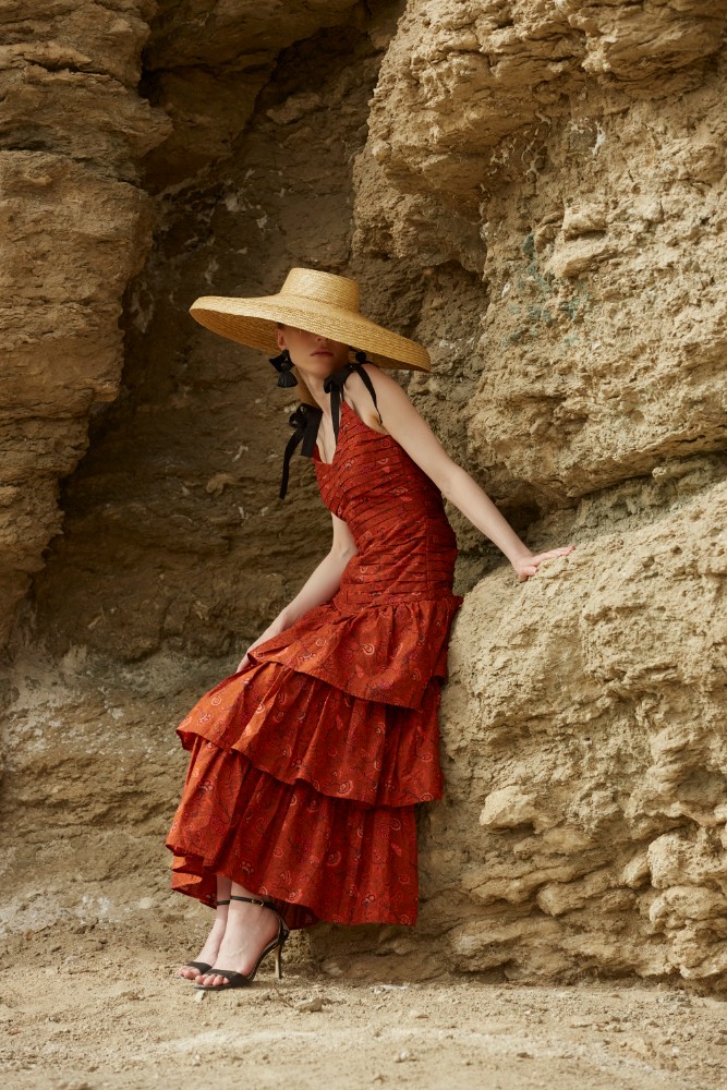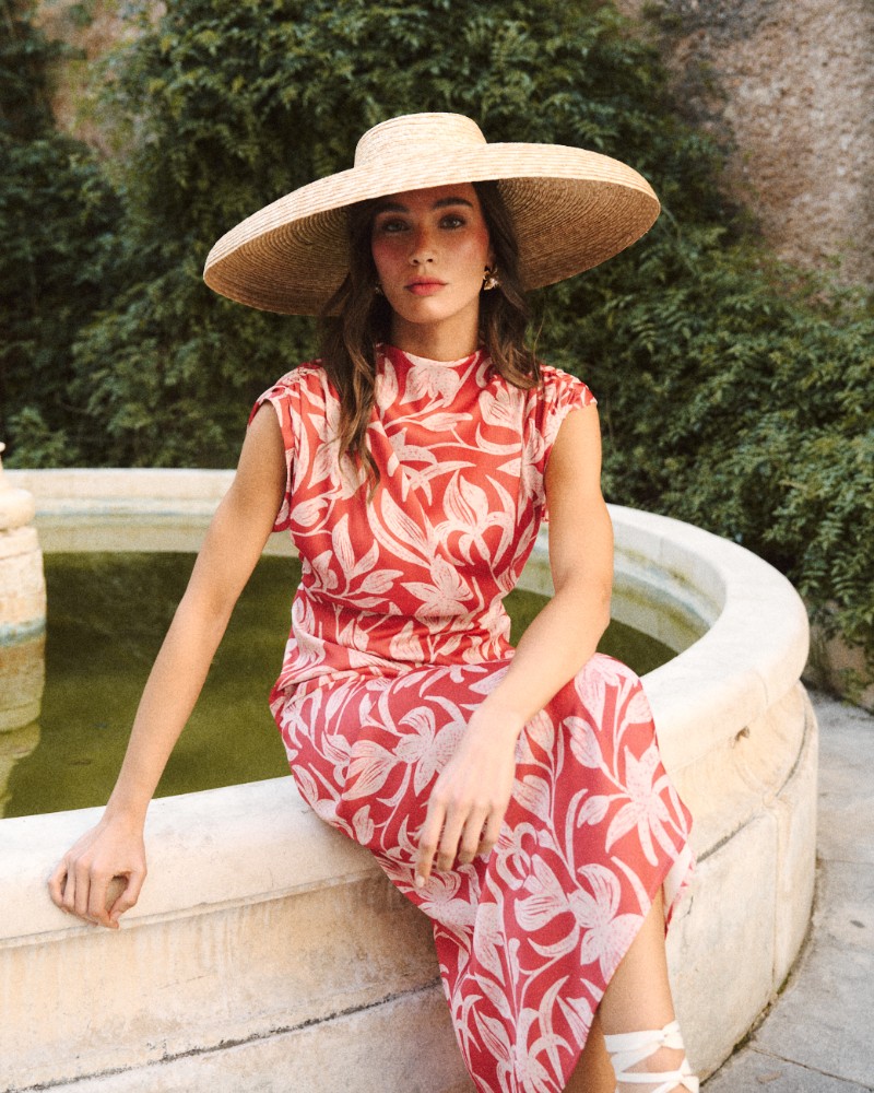 Pamela de paja trenzada 9-10 mm, confeccionada en España. Tiene una altura de copa de 6 cm aprox. y el ala de 17 cm aprox., más 4 cm. aprox. de caída hacia abajo. El diámetro total es de 52 cm aprox. Incluye sujeción con diadema.