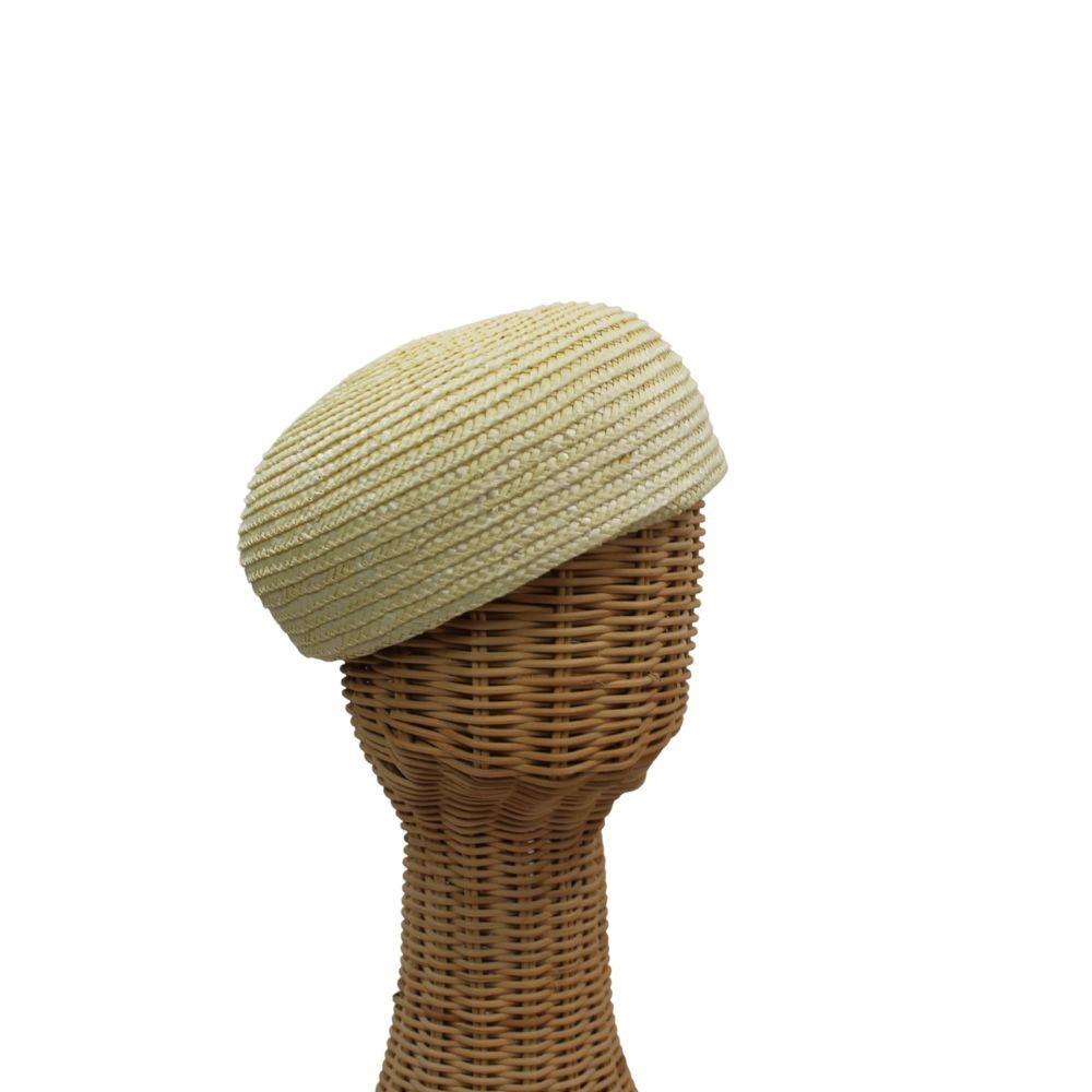 Cap-shaped braided straw headdress. Measurements: approx. 18 cm in diameter and approx. 6 cm in height. Worn tightly on the head. Approximately size 57.