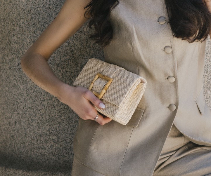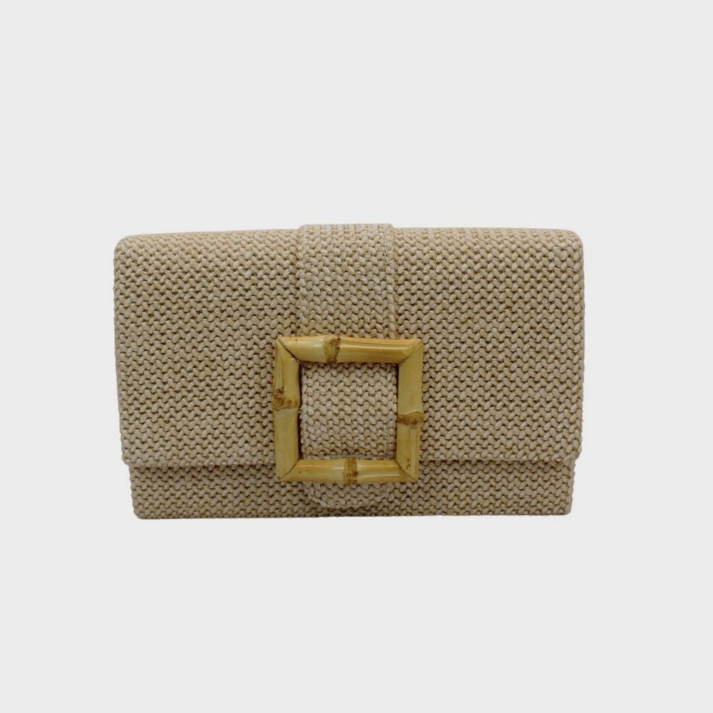 Rectangular flap bag with a raffia-style finish and a bamboo-buckle detail on the clasp. Features an internal pocket, as well as an optional gold-tone metal chain strap for carrying.