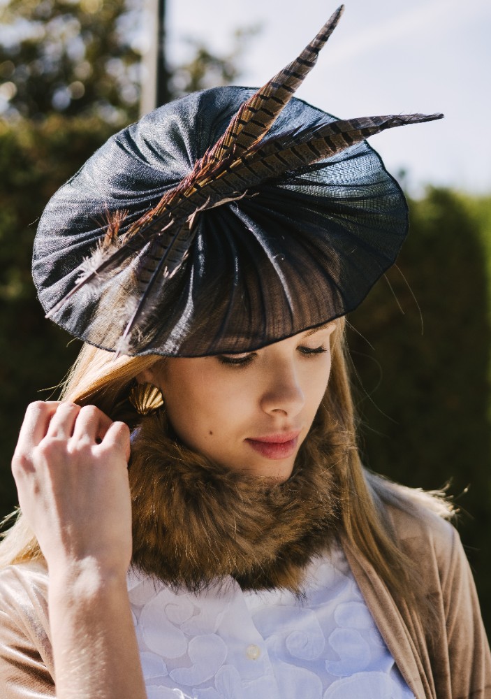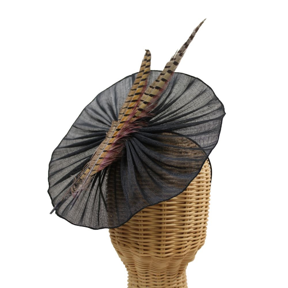 Headdress made up of a gathered abaca disc decorated with two natural pheasant feathers. Diameter: approx. 28 cm. Fastened with a headband.