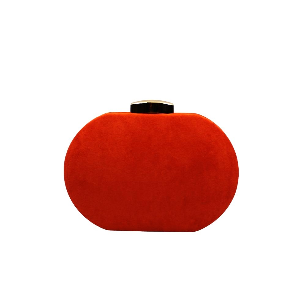 Bolso fiesta tipo clutch ovalado de 20 x 14 cm aprox. Esta forrado en antelina, cierre de imán. Dispone de cadena para colgar en el interior (opcional).
