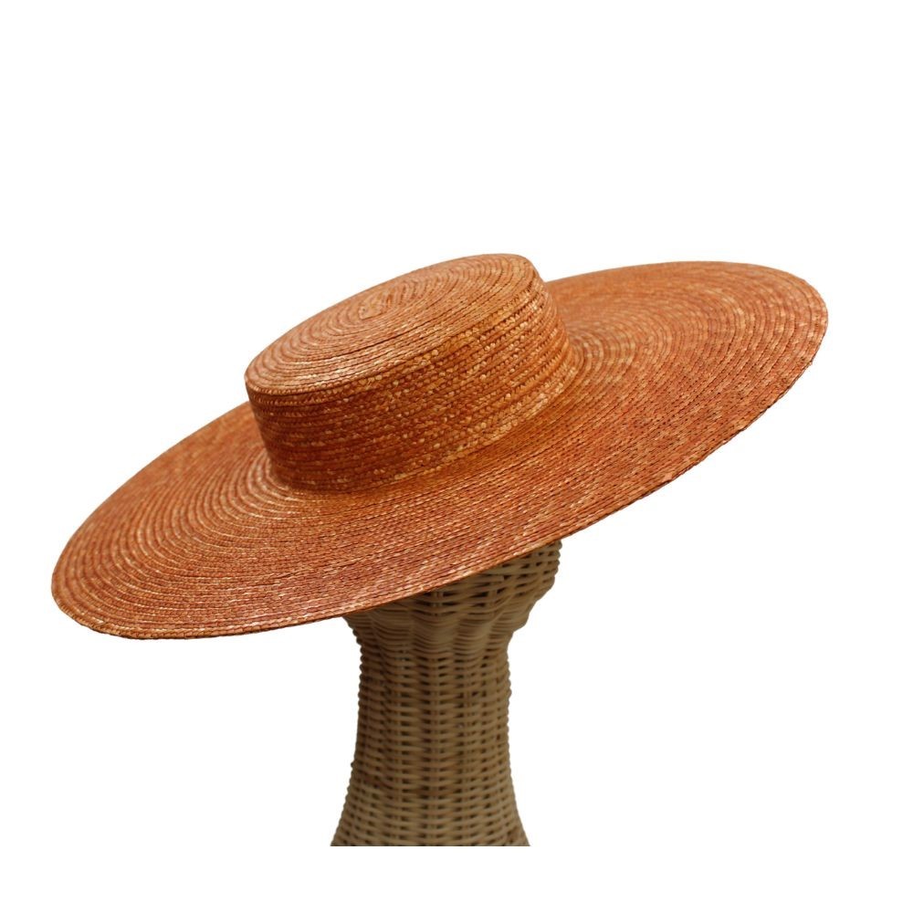 Canotier de paja trenzada confeccionado en España. Ala entre 13-14 cm. aprox., altura de copa 5 cm. aprox. Diámetro total 44 cm. aprox. Necesita sujeción (no incluida).