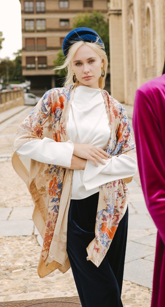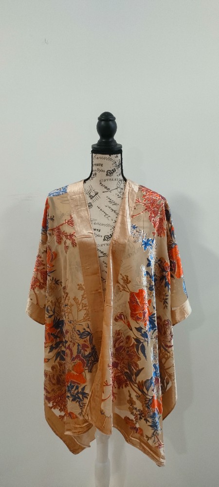 Kimono de gasa con flores de terciopelo bordadas. Composición: 30% seda, 70% viscosa. Talla única. Medidas: 1,08 x 83 cm. aprox.