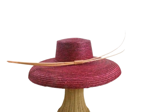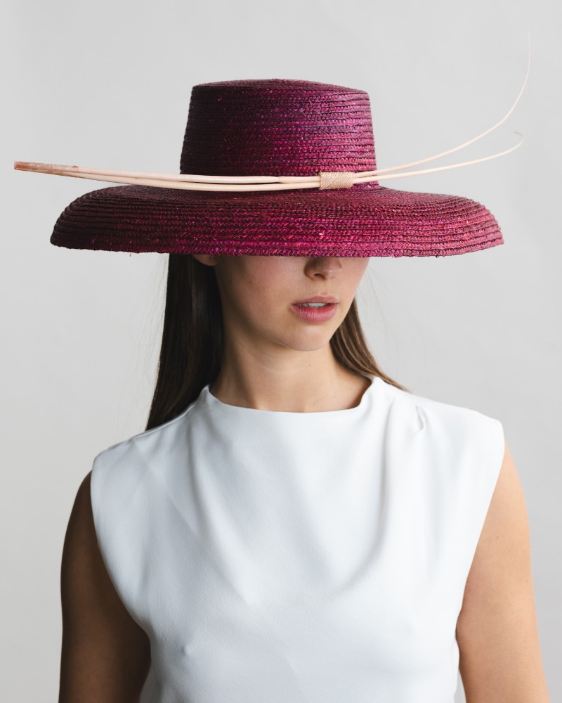 Pamela de paja 9-10 mm. confeccionada en España, adornada con raquis en contraste. Medidas: altura de copa 8 cm. aprox. Ala ligeramente inclinada hacia abajo: 13-14 cm. aprox. Diámetro total: 43 cm. aprox.