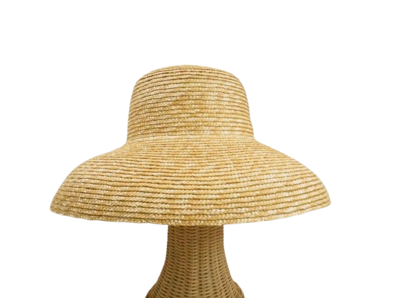 Pamela tipo cloché de paja trenzada confeccionada en España. Tiene copa redonda de 9,5 cm. aprox. de altura y ala de 12 cm. aprox. Diámetro total de 35 cm. aprox. Talla M (57 cm. aprox.)