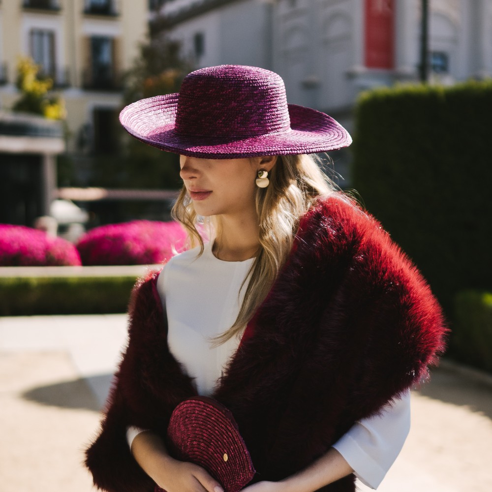 Pamela de paja trenzada 9-10 mm. confeccionada en España, con copa redonda de 9 cm de altura y diámetro de 38 cm. aprox. Está aprestada, tiene una parte del ala inclinada hacia arriba, lo que permite colocarla en varias posiciones. Disponible en talla M (57 aprox.) y talla L (58 aprox.)