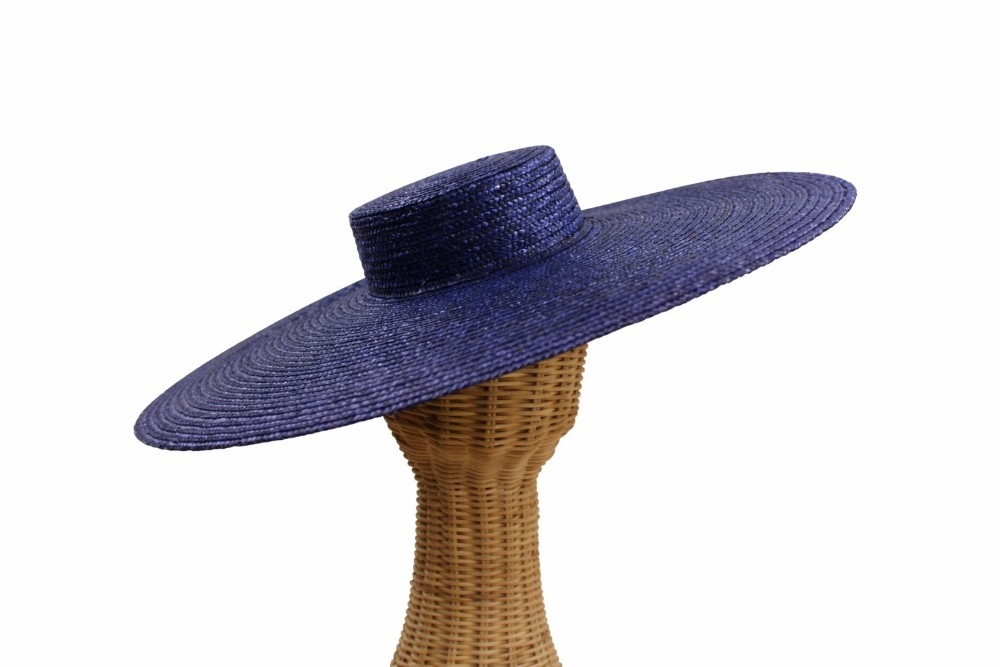 Pamela de paja trenzada 9-10 mm confeccionada en España. Tiene un diámetro total de 50cm aprox. La altura de la copa es de 5cm aprox. Se apoya sobre la cabeza. Requiere goma o diadema para sujeción (no incluida).