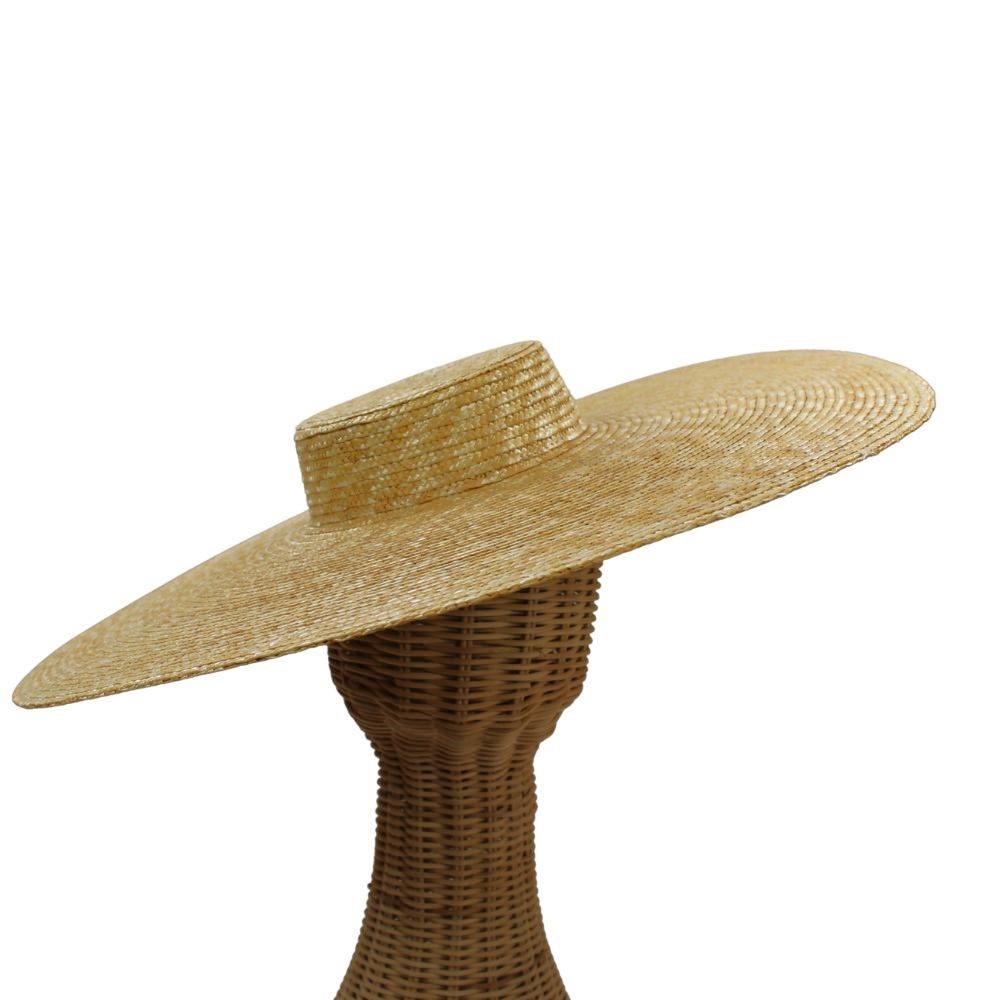 Pamela de paja trenzada confeccionada en España. Tiene un diámetro total de 50 cm. aprox. La altura de la copa es de 5cm aprox. Se lleva "posada" sobre la cabeza, no encaja. Incluye diadema como sujeción.