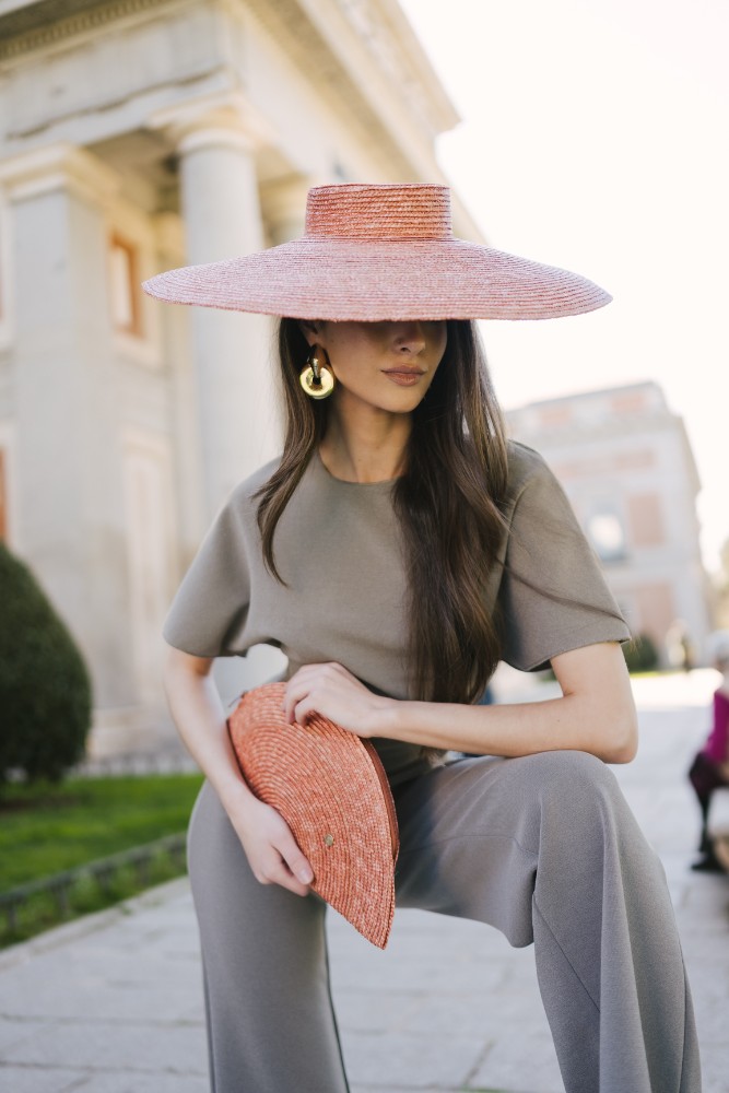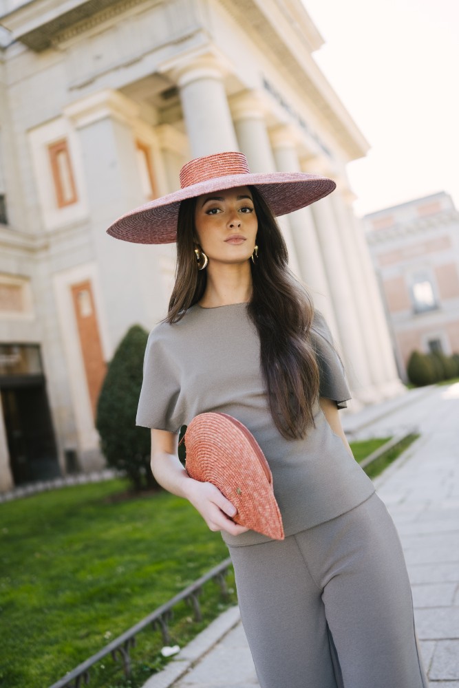 Pamela de paja trenzada 9-10 mm confeccionada en España. Tiene un diámetro total de 50cm aprox. La altura de la copa es de 5cm aprox. y el ala está ligeramente inclinada hacia abajo. Se apoya sobre la cabeza (no encaja). Incluye diadema para sujeción.