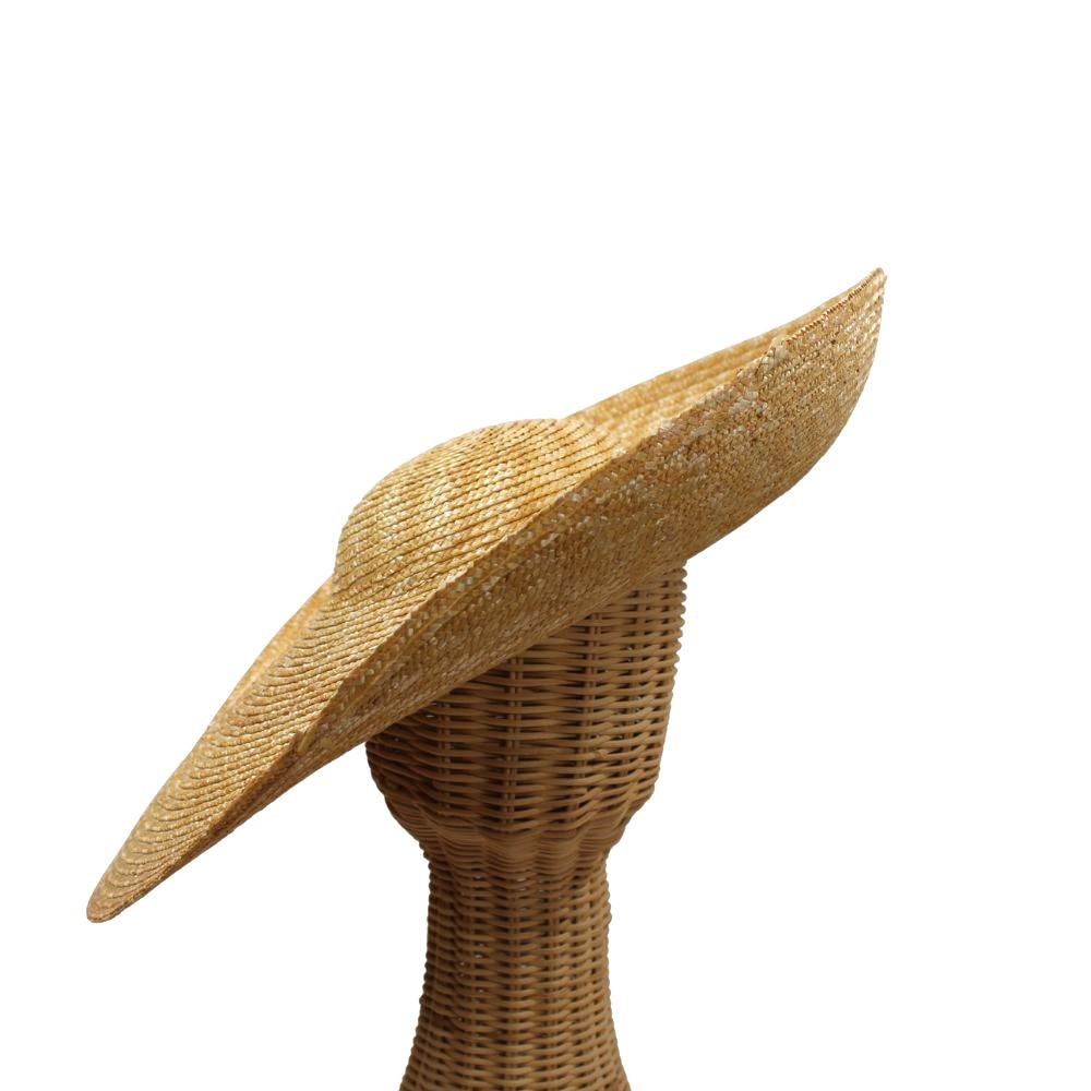 Pamela de paja trenzada tipo saucer confeccionada en España. Tiene el ala inclinada hacia arriba por un lado. El diámetro total es de 47 cm aprox. La altura de la copa es de 3-4 cm aprox. Incluye sujeción con diadema.