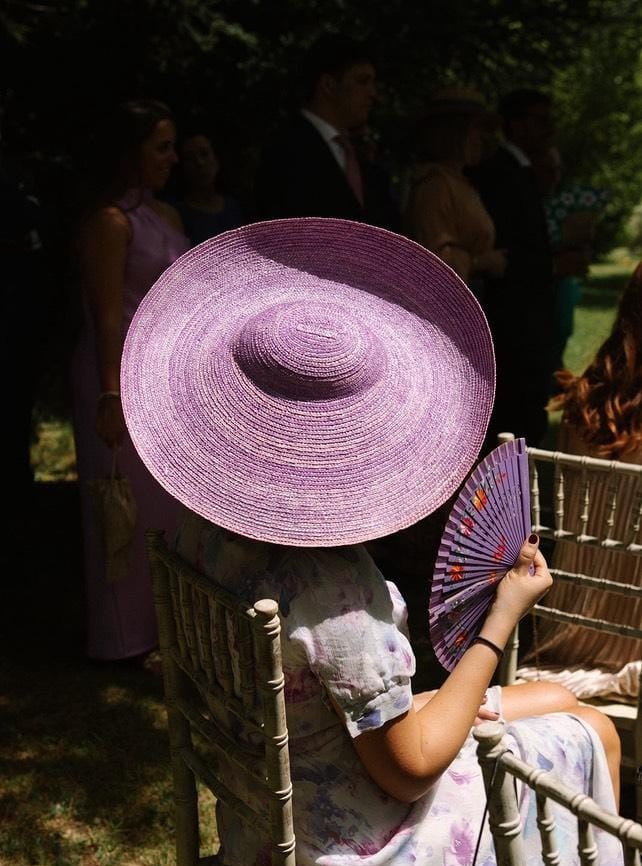 Pamela-tocado cosido en paja trenzada y confeccionado en España.Tipo saucer. Tiene el ala inclinada hacia arriba por un lado. El diámetro total es de 47 cm aprox. La altura de la copa es de 3-4 cm aprox. Necesita sujeción (no incluida).