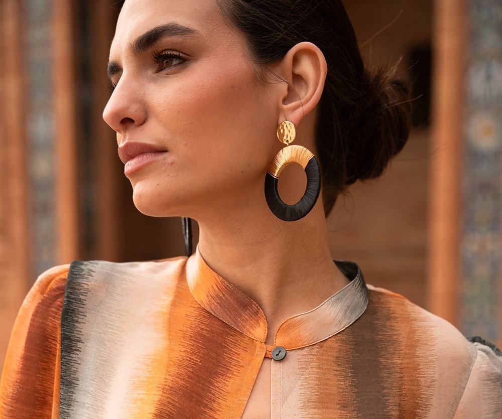 Par de pendientes en forma de aro ancho recubiertos en su mitad superior por hilo dorado. Longitud: 5,5 cm. aprox.