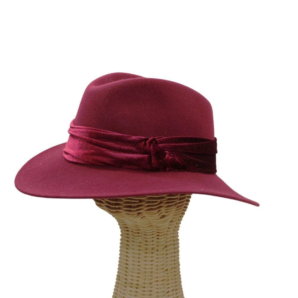 Sombrero Fedora 100 % fieltro de lana, adornado con banda de terciopelo al tono.