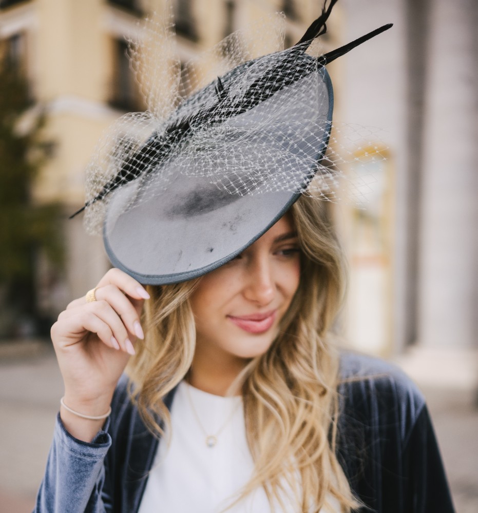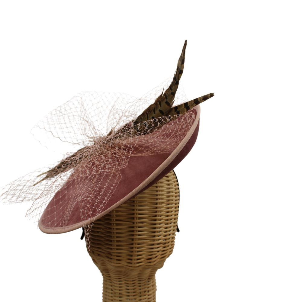 Tocado con base tipo saucer forrado de terciopelo y adornado con plumas de faisán y velo. La medida es de 30 cm. aprox. Se sujeta con diadema (incluida). Hecho en España.