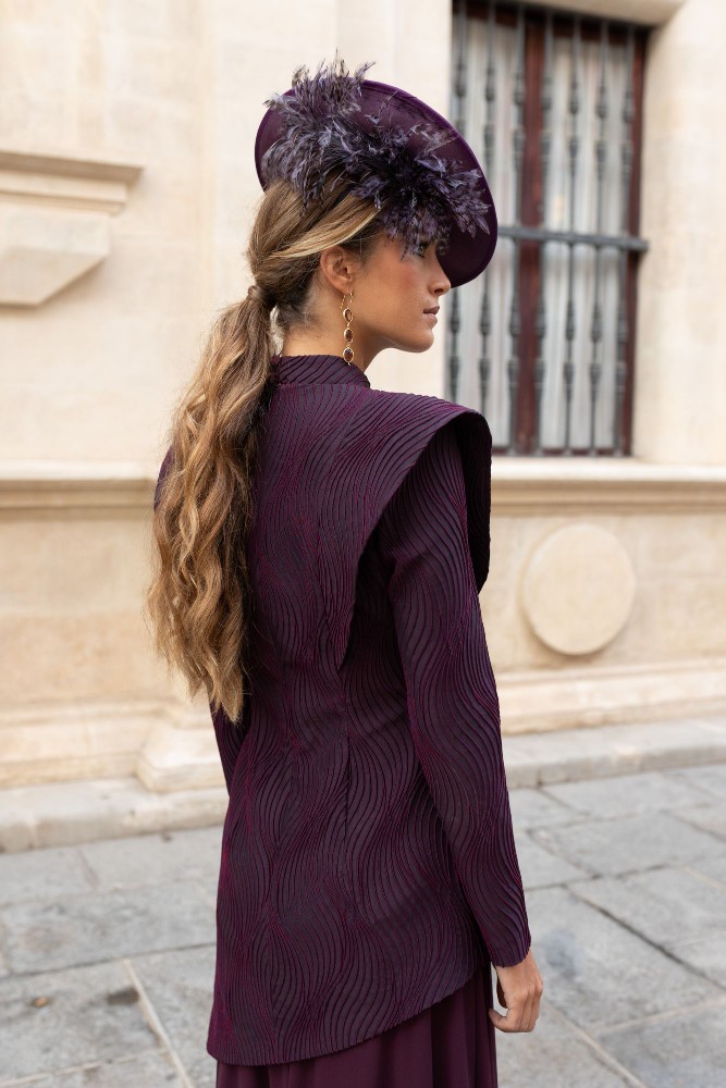 Tocado con base tipo saucer de terciopelo ribeteada en grosgrain y adornada con pomo de plumas al tono. La medida es de 30 cm. aprox. Se sujeta con diadema (incluida). Hecho en España.