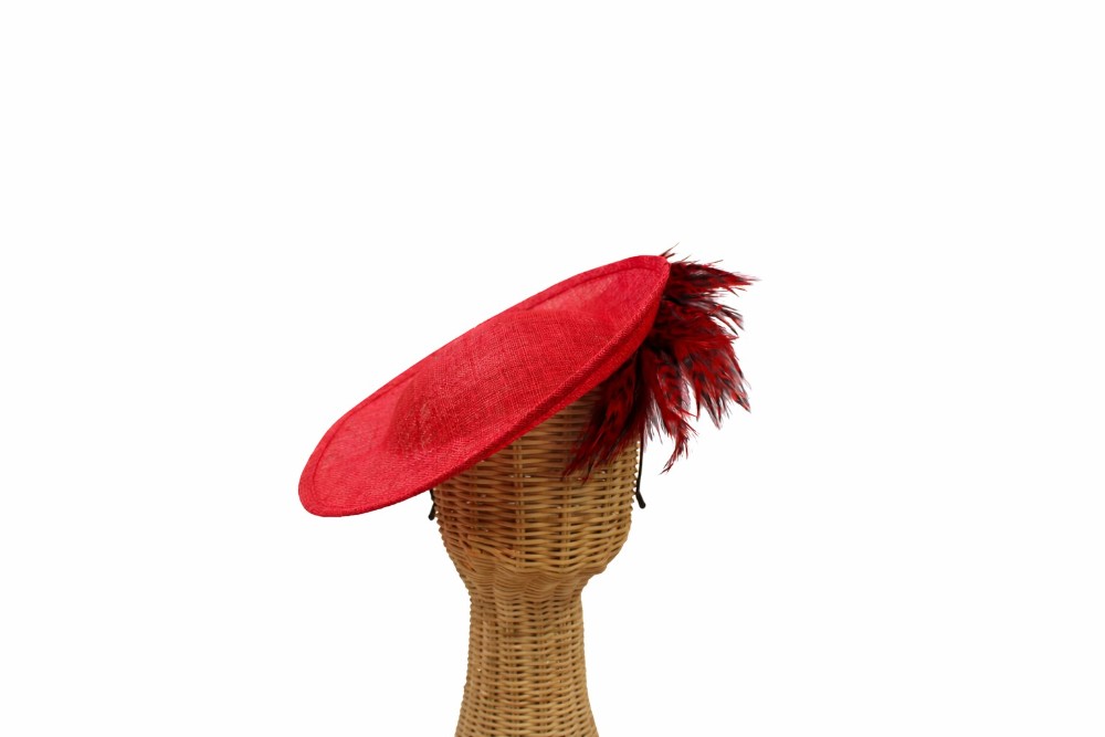 Tocado con base tipo saucer confeccionada con doble capa aprestada y alambrada de sinamay y adornada con pomo de plumas al tono. La medida es de 30 cm. aprox. Se sujeta con diadema (incluida). Hecho en España.