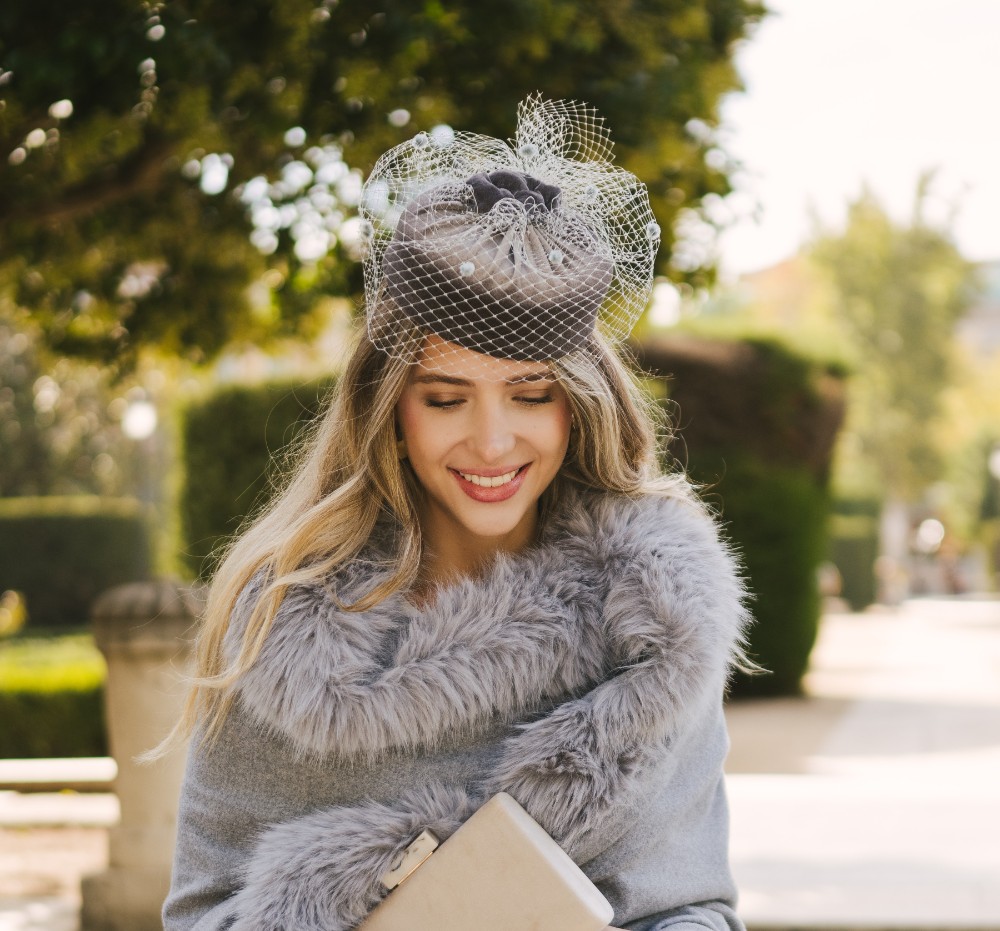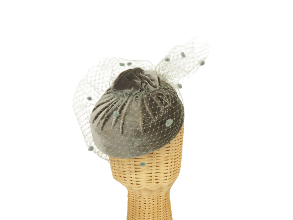 Tocado tipo pillbox forrado de terciopelo adornado con un nudo de terciopelo en la parte superior y velo hexagonal. LLeva dos trabillas en la parte interior para poder sujetar el tocado con horquillas o diadema.