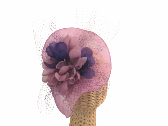 Tocado formado por una base alambrada de pinokpok, adornada con flores de gasa y velo. Lleva una peineta como sujeción.