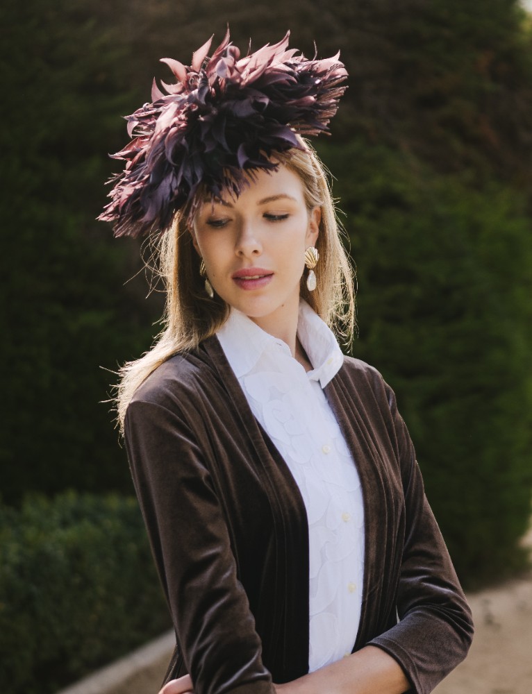 Tocado realizado con nuestra base Arak en varios colores y adornado con plumas al tono.