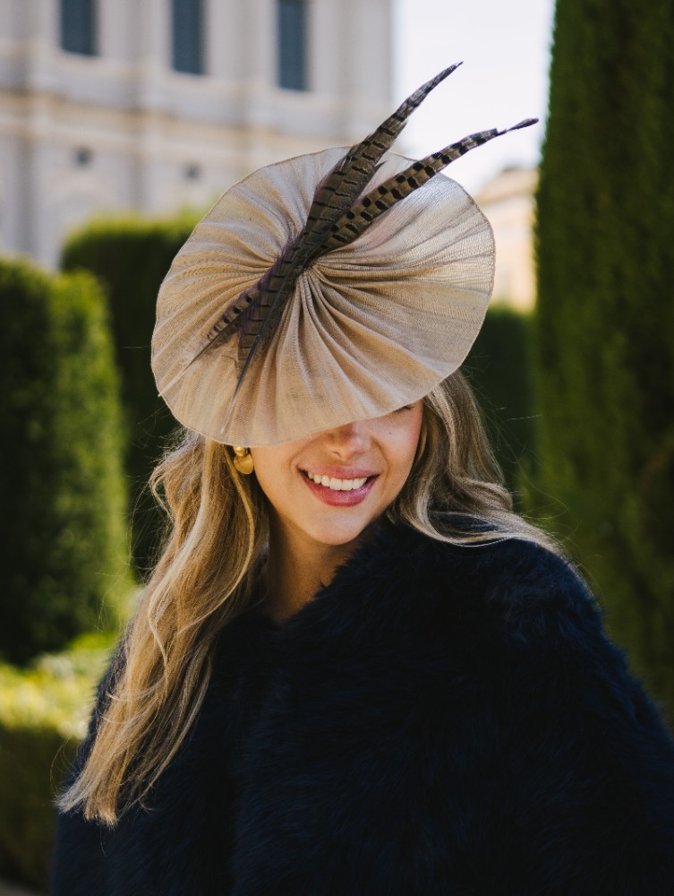 Tocado formado por un disco plisado de abaca adornado con dos plumas de faisán natural. Diámetro: 24 cm. aprox. Lleva sujeción con diadema.