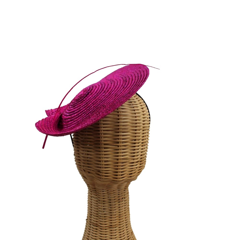 Tocado formado por un disco de paja trenzada decorado con un raquis al tono. Sujeción con diadema.